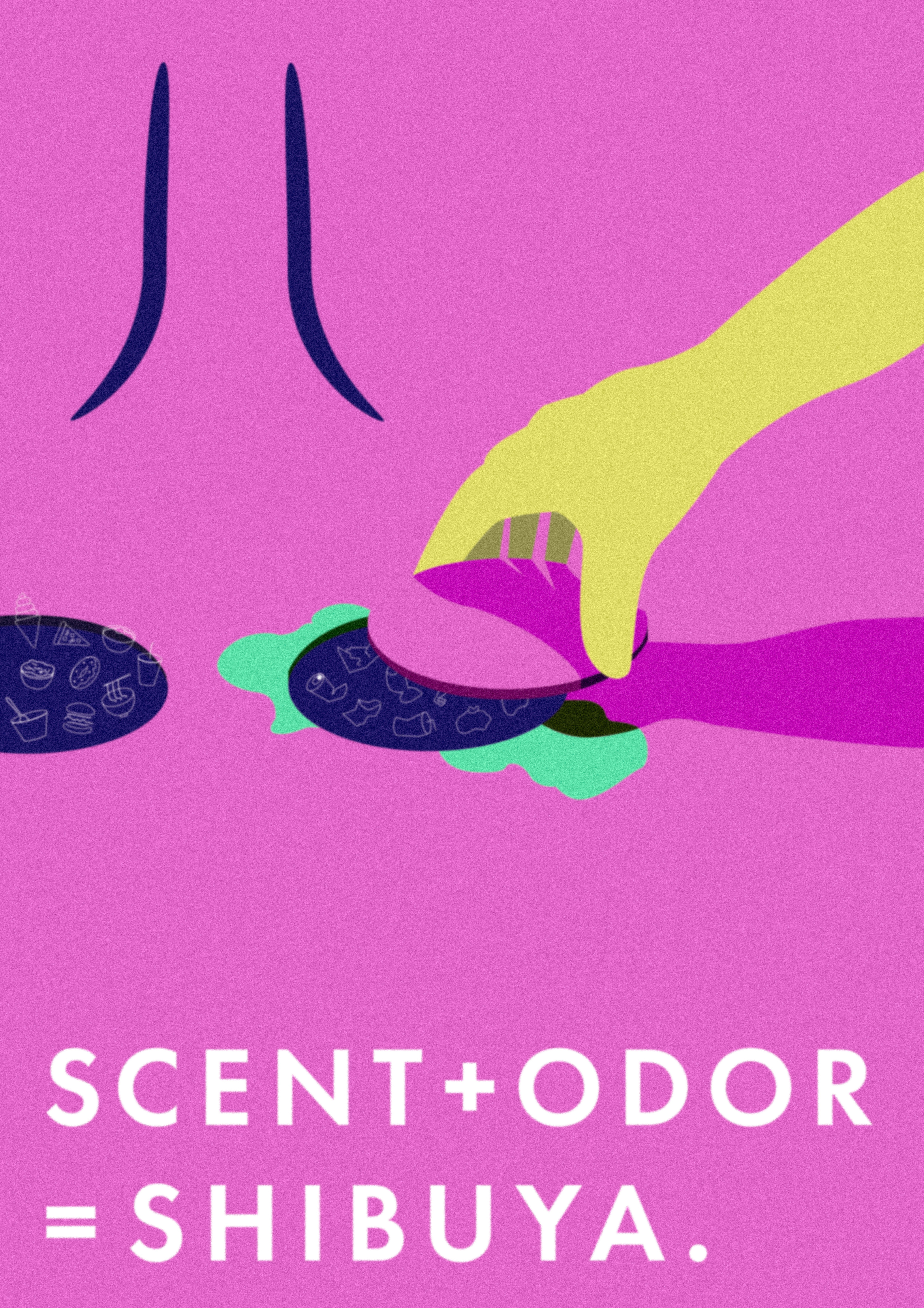 渋谷の共感と反発というテーマでポスターを制作しました。渋谷に行き始めて数ヶ月だったため、まだ匂い・臭いに慣れていませんでした。そこで、SCENT(匂い)を共感、 ODOR(臭い)を反発として、渋谷に対する自己の感性をグラフィックで表現しました。